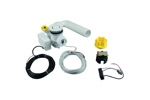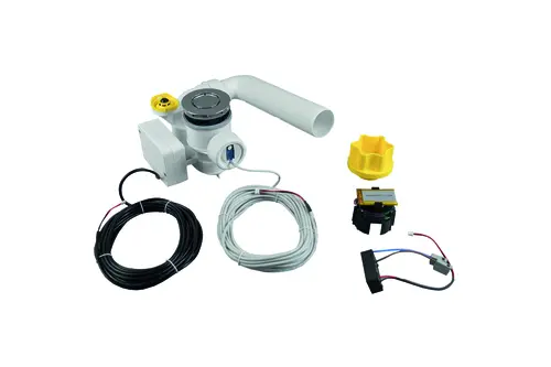 - Im Lieferumfang der Ablaufgarnitur befindet sich eine Steuerbox, ein 12 V Netzteil, eine Notbatterie und zwei 8 m lange Steuerkabel.