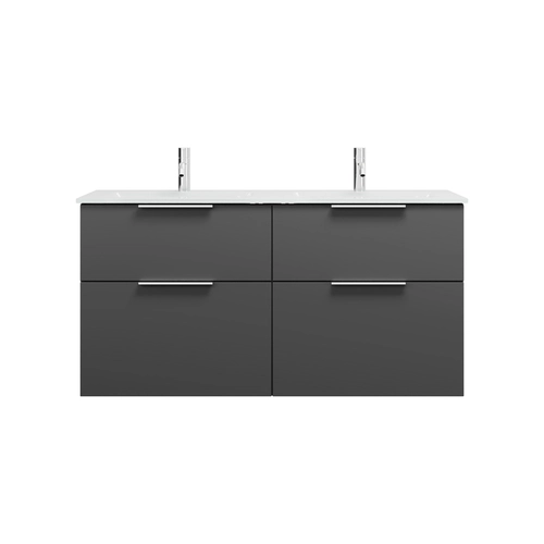 - Acrylfront Hochglanz mit Laserkante / Korpusaussenseiten Melamin Glänzend: Weiß Hochglanz, Grau Hochglanz (Böden/Rückwand: Anthrazitgrau)