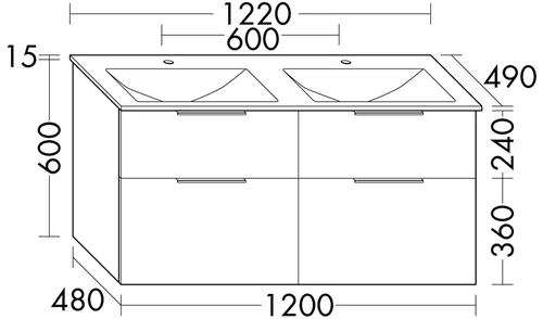 - 2 Schubladem oben, 350 mm tief, mit Siphonausschnitt und Inneneinteilung