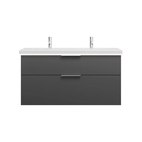 - Acrylfront Hochglanz mit Laserkante / Korpusaussenseiten Melamin Glänzend: Weiß Hochglanz, Grau Hochglanz (Böden/Rückwand: Anthrazitgrau)