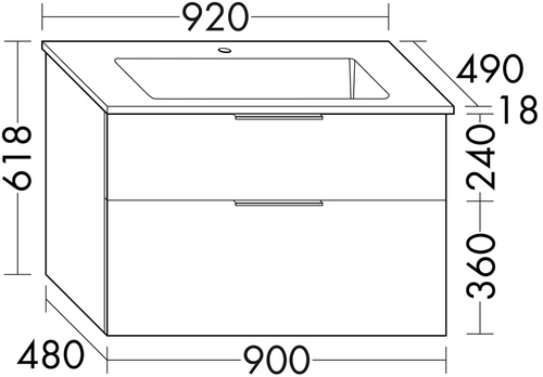 - 1 Schublade oben, 350 mm tief, mit Siphonausschnitt und Inneneinteilung