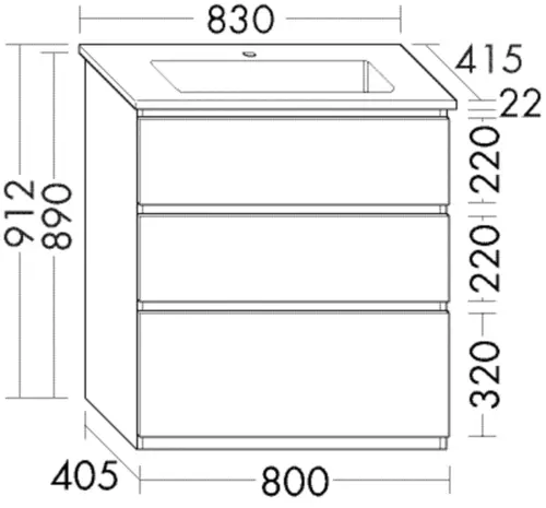 - Beckenmaß B/T/H = 830 mm x 415 mm x 22 mm