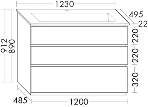 - Beckenmaß B/T/H = 1230 mm x 495 mm x 22 mm