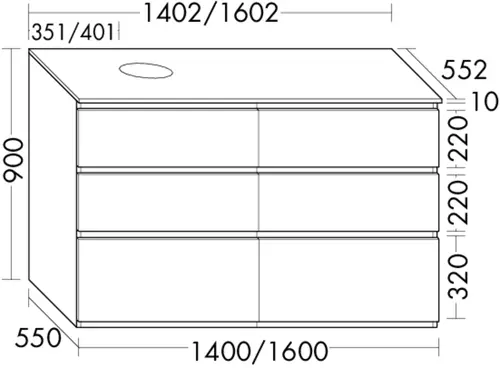 Komplettmaß: B/T/H = 1602 mm x 552 mm x 900 mm