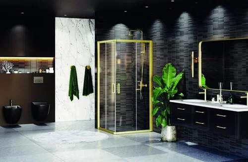 - Teilgerahmter Eckeinstieg mit zwei Gleittürsegmenten, je nach einer Seite öffnend, mit zwei festen Segmenten