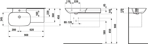 LAUFEN INO Waschtisch, 1 Hahnloch, ohne Überlauf, Keramikablage rechts, 900x450mm