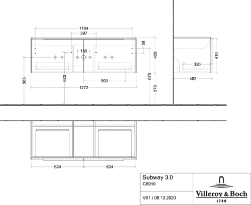 Villeroy & Boch Subway 3.0 Waschbeckenunterschrank, 2 Auszüge, Waschbecken mittig, 1272x429x478mm