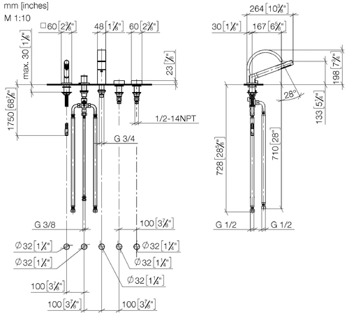 Dornbracht CYO Wannen-Fünflochbatterie für Wannenrand- bzw. Fliesenrandmontage, Ausladung 167mm