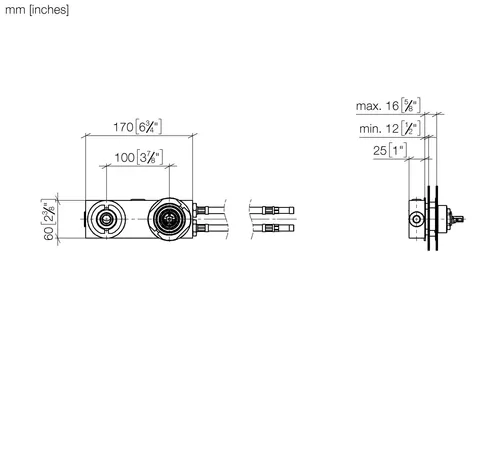 - Rückwände mit Wandstärke: 12-16mm, Lochdurchmesser Auslauf: 40mm, Lochdurchmesser Mischer: 58mm, lichte Weite hinter der Wand: 25mm