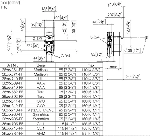 - 2 x Anschluss 3/4" IG (kalt/warm), DN 15