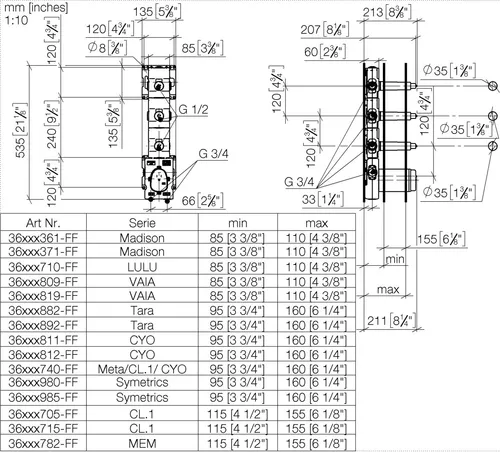 - 2 x Anschluss 3/4" IG (kalt/warm), DN 15