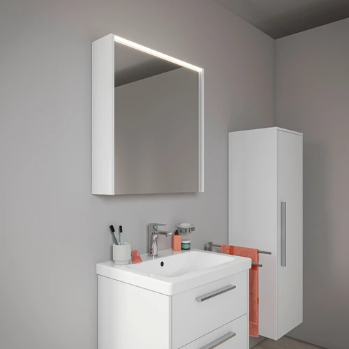 Duravit D-Code mirror cabinet, socket outlet type F (EU, DE), 1 door with right-hand stop, LED light panel at top, 651x700mm, 5 W