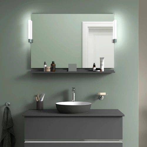 - mit 2 LED-Aufsatzleuchten außen seitlich und 1 Ablage