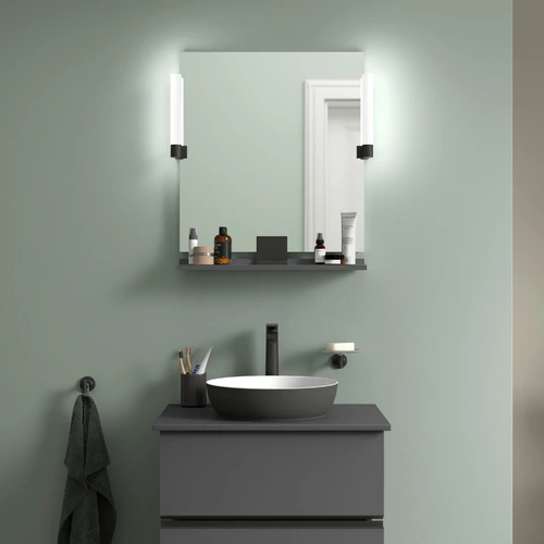 - mit 2 LED-Aufsatzleuchten außen seitlich und 1 Ablage
