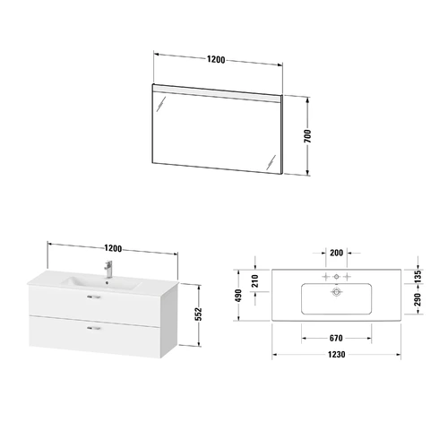 Duravit Xbase, Möbel-Set wandhängend, mit LED-Spiegel, Waschtisch und Waschtischunterschrank, Breite 1200 mm
