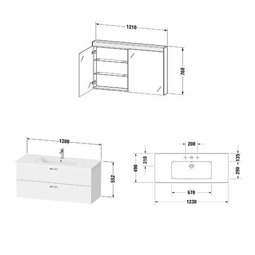 Duravit Xbase, Möbel-Set wandhängend, mit LED-Spiegelschrank, Waschtisch und Waschtischunterschrank, Breite 1200 mm