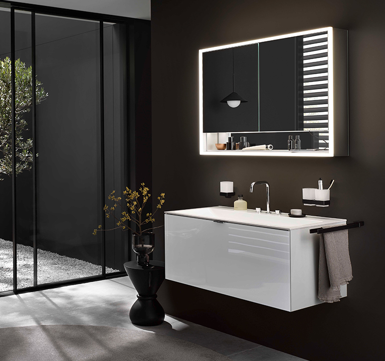 The all-round LED lighting of the new loft illuminated mirror cabinet creates a radiant accent on the wall. An innovative feature is a recessed grip below the mirror with a concealed light control that can be operated from the outside. There is also a cable outlet here to allow the use of electrical devices even when the mirror doors are closed. Another highlight: the open lower compartment – illuminated and mirrored – as an optional variant.