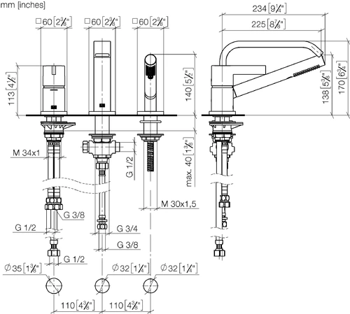 Dornbracht IMO three-hole single-lever bath mixer for bath rim or tile rim installation, projection 224 mm