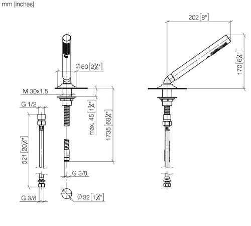 - 1 x hose shower set for bath rim or tile rim installation