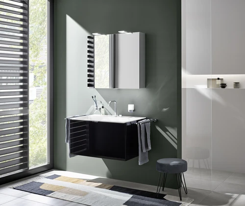 emco pure 2 style LED light mirror cabinet with top spotlights, 1 door hinges changeable, 600x711x153mm