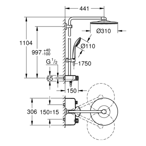 - Shower system with thermostatic mixer, wall mounted, chrome