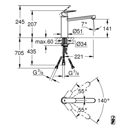 GROHE Eurosmart Cosmopolitan single-lever sink mixer, low pressure, 221mm projection, medium-high, swivelling
