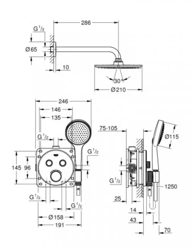 - Concealed thermostat with 2 shut-off valves and integrated shower holder