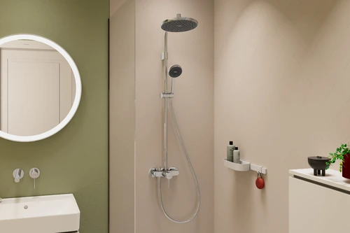 - Consists of: Shower bar, overhead shower, hand shower, hand shower holder, single-lever shower mixer, shower hoses
