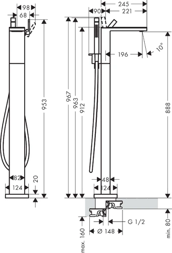 - consists of: Single lever bath tub mixer, floor standing, hand shower, shower hose, shower head holder