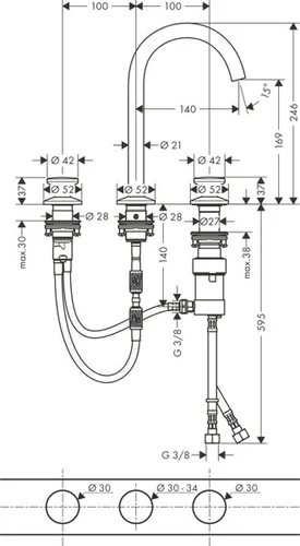 hansgrohe AXOR One 3-hole washbasin fittings Select+ 170 with push-open drain set, projection 140mm