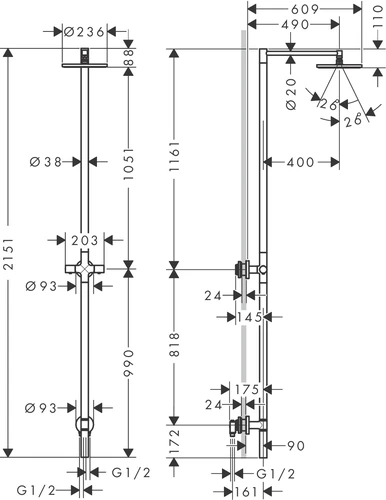 • Scope of delivery: shower column, overhead shower, bar hand shower, shower mixer, shower hose