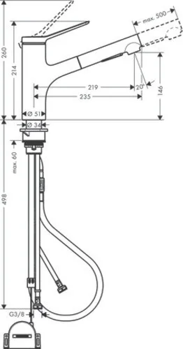 - With pull-out spray (0.5 m) for a larger action radius around the kitchen sinks