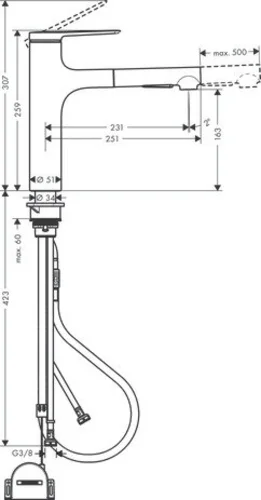 - With pull-out spray (0.5 m) for a larger radius of action around the kitchen sink