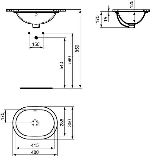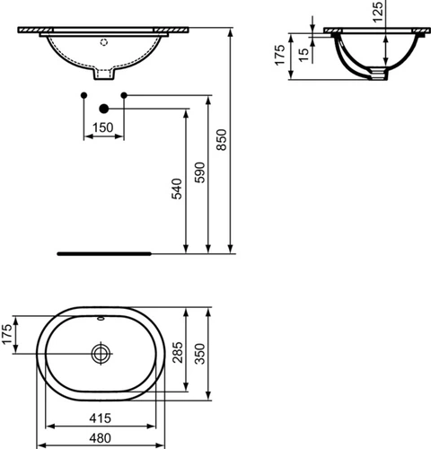 Ideal Standard Connect under-counter washbasin, without tap hole, with overflow, 480x350x175mm