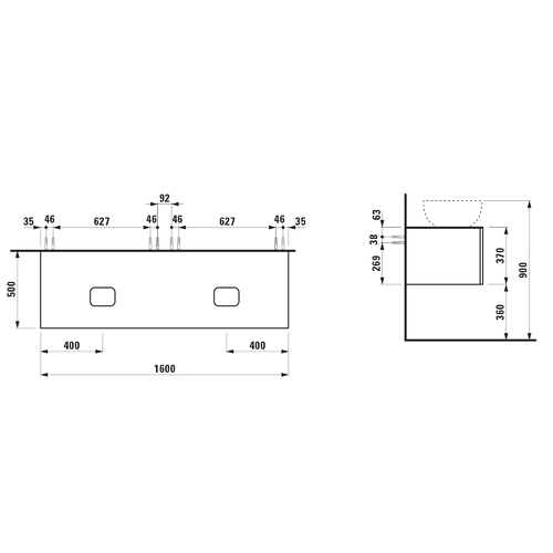 • Width: 1600 mm, Depth: 500 mm, Height: 370 mm