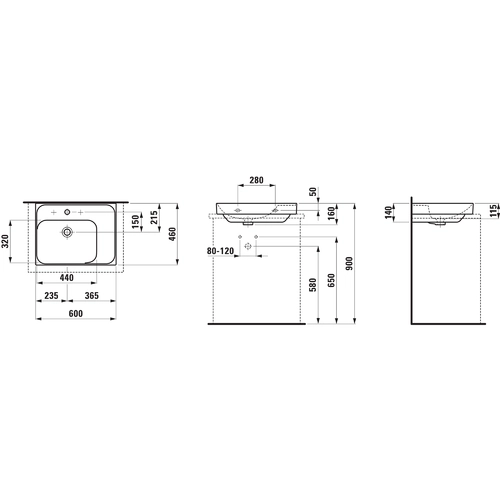 LAUFEN MEDA countertop washbasin, polished, shelf right, 600x460mm, 1 tap hole, without overflow
