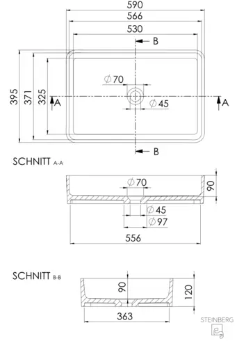 Steinberg Seriesss 440 Countertop washbasin, angular, without overflow, 590x195x120mm, SOLIDSurface