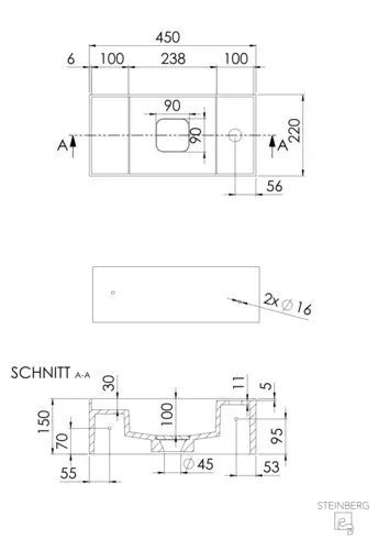 Steinberg Seriesss 440 wall-mounted Washbasin, with overflow, with tap hole, 450x220x150mm, SOLIDSurface