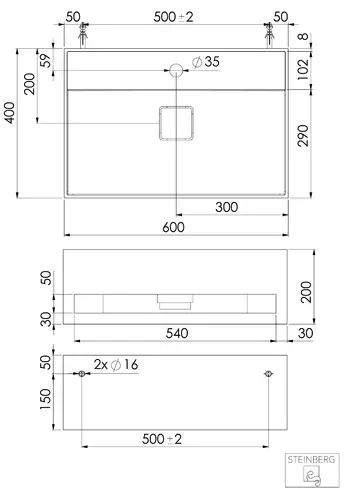 Steinberg Seriesss 443 wall-mounted washbasin, with towel rail, 600x400x200mm, 1 tap hole, with overflow, SOLIDSurface