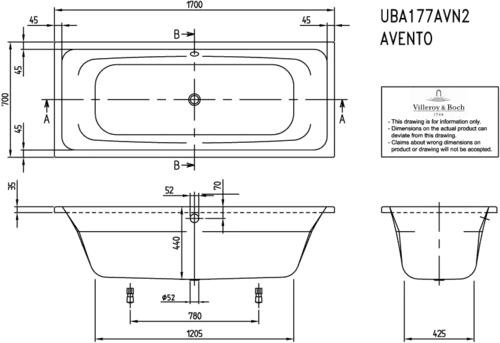 Villeroy & Boch Avento rectangular bathtubs, 1700x700x505mm, white alpin
