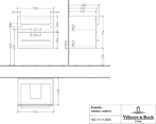 Villeroy & Boch Avento washbasin vanity unit, 2 pull-outs, 580x514x484mm, handle Chrome glossy