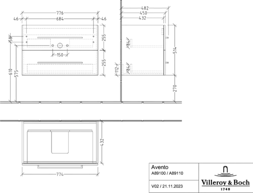 Villeroy & Boch Avento washbasin vanity unit, 2 pull-outs, 780x514x484mm, handle Chrome glossy