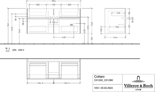 Villeroy & Boch Collaro vanity unit, 4 pull-out drawers, washbasin centre, with lighting, 1154x546x444mm