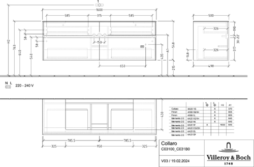 Villeroy & Boch Collaro washbasin vanity unit, 4 pull-outs, washbasin centre, wall-mounted, with lighting, 1600x548x500mm