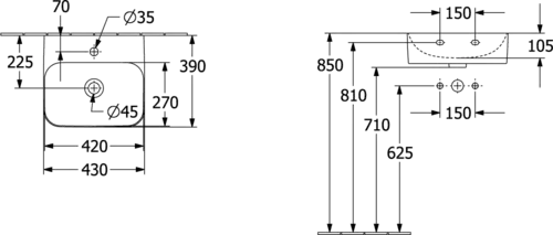 Villeroy & Boch Finion handbasins, without overflow, 1 tap hole, 430x390mm