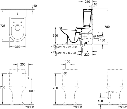 Villeroy & Boch Hommage Washdown WC, for combination, floor-standing, for wall-mounted flush tank, horizontal outlet, 370x725x390mm