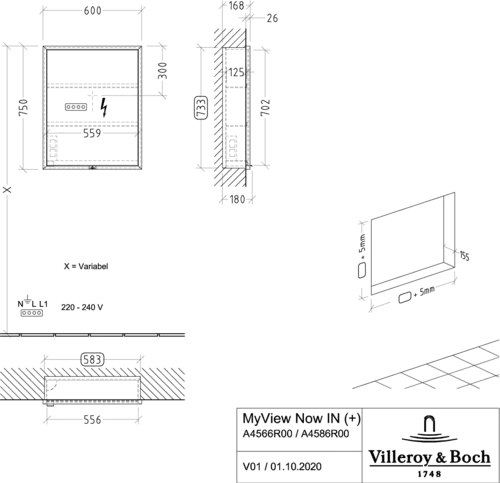 Villeroy & Boch My View Now built-in mirror cabinet, 1 door, hinged right, with lighting, with on/off switch, Smart Home compatible, 600x750x167.5mm