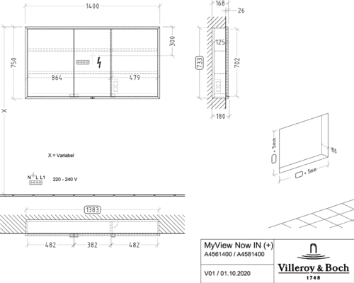 Villeroy & Boch My View Now built-in mirror cabinet, 3 doors, with lighting, with on/off switch, Smart Home compatible, 1400x750x167.5mm