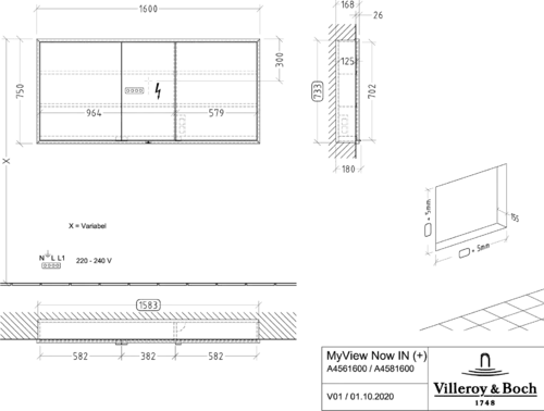 Villeroy & Boch My View Now built-in mirror cabinet, 3 doors, with lighting, with sensor dimmer, 1600x750x167.5mm