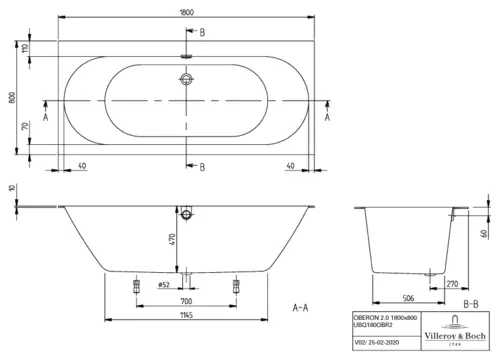 Villeroy & Boch Oberon 2.0 Duo rectangular bathtubs, built-in, 1800x800x485mm